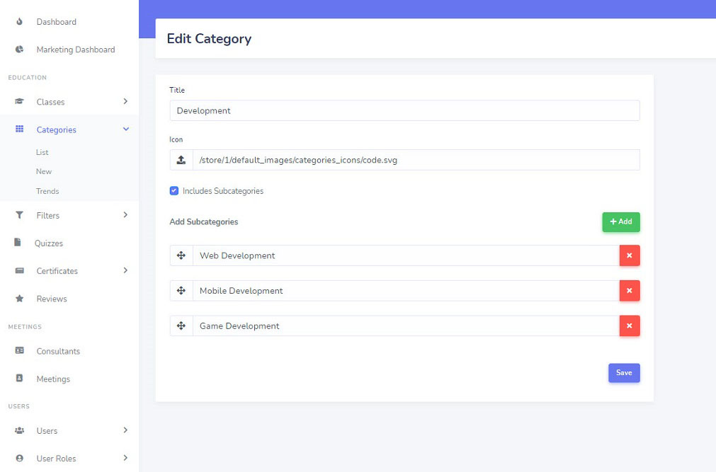 Categories will be displayed on the website header and instructors will assign classes to related categories during the course creation process.