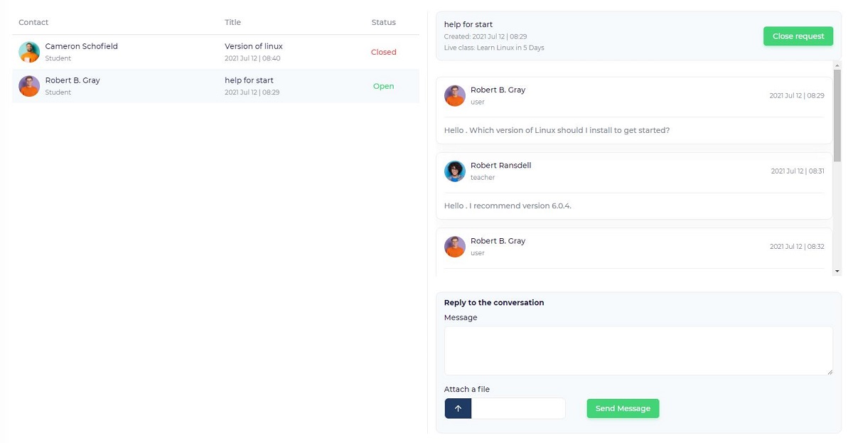 One of the most important features of each LMS system is the course support system. It helps the students and instructors get in touch. If an instructor turns the “Support” option on the course creation process, this option will be accessible for students so they will be able to send support messages through their panel. The course support conversation is between the student and the instructor but the admin account also can check it through the admin panel. The admin can delete a conversation and reply to it by clicking on the related icons in the “Controls” column in the class support messages list.