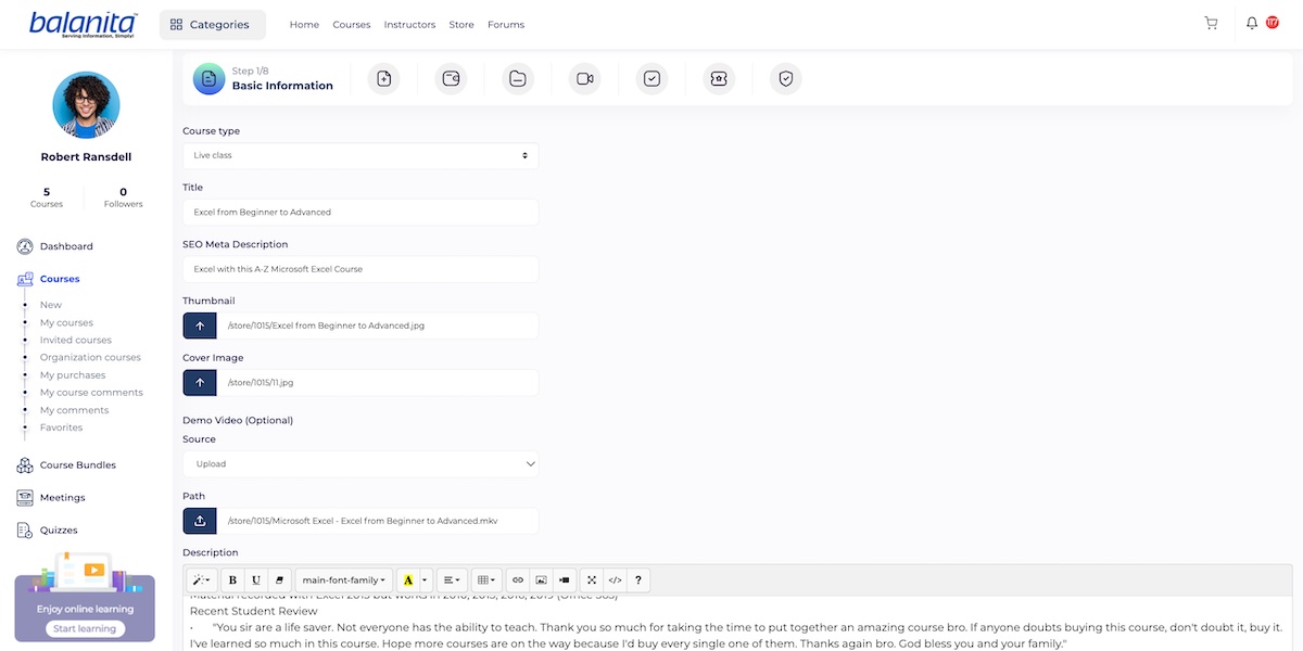 Description: The class description that will be displayed on the class page includes all of the information about the course educational material, instructor, and other related information that will motivate viewers to enroll in the course. We suggest writing at least 300 words for this page because it is one of the most important SEO requirements.