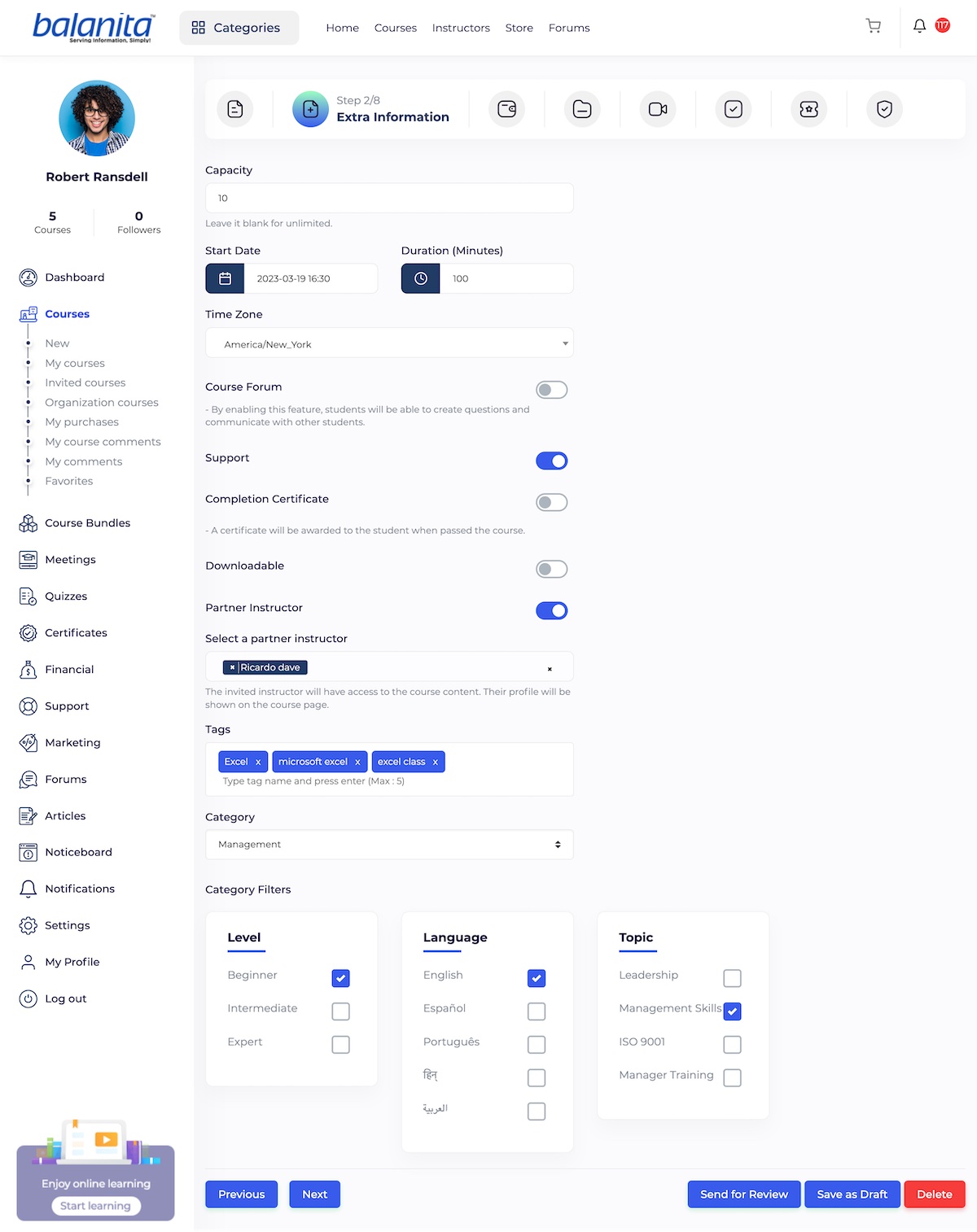 Partner instructor: If you want to invite another instructor to your course, you should turn this toggle on so the partner instructor dropdown will be displayed and you will be to add single or multiple instructors to the course. The invited instructor profile will be displayed on the course page and the invited instructor will be able to view the course through the “Instructor panel/ Classes/ Invited classes”.