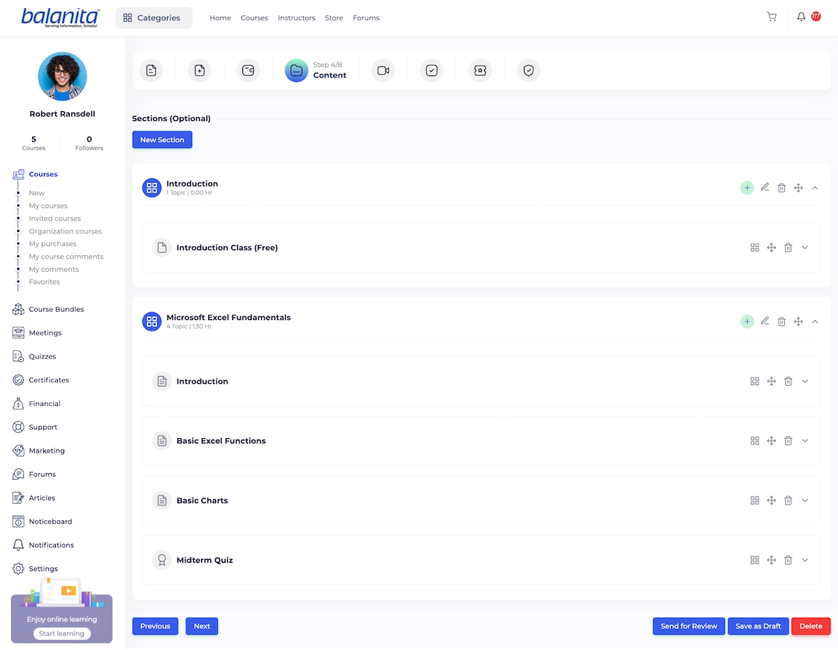 This step is the most important step in the course creation process. All of the course materials like videos, files, projects, live session, assets, circulium, etc will be This steps varies depending to the class type (Live Class, course, text course). We are going to explain different content types that could be defined as course content.