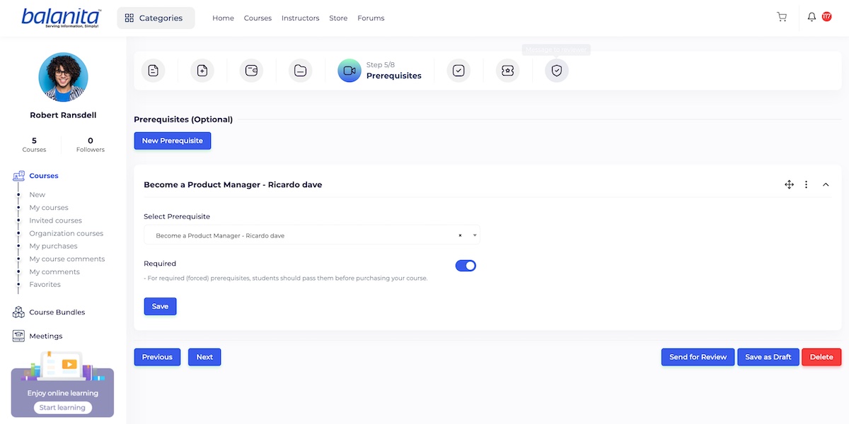 To add a new prerequisite click on the “Add” button and search in existing courses. If you want to add a “Required” prerequisite turn the toggle button on.
