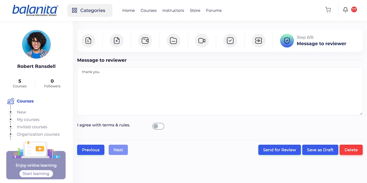 In this step, the instructor should agree on terms and rules. If there are important points for a reviewer, the instructor can write them in the message field.