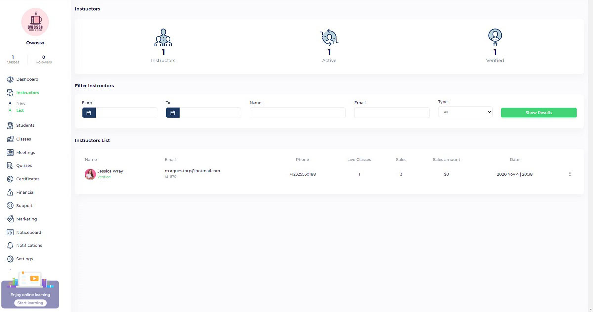 One of the organization's accounts features is exclusive instructors and students. Organizations can define the related students and instructors from their panel under the “Instructors” and “Students” menus.