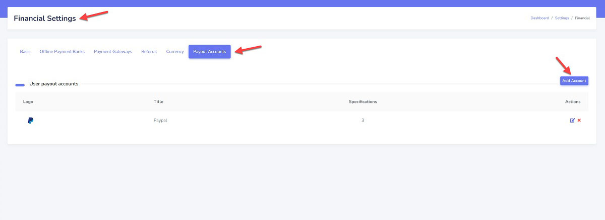 Please go to the “Admin Panel/ Settings/ Financial/ Payout Accounts” menu. And click on the “Add Account” button.