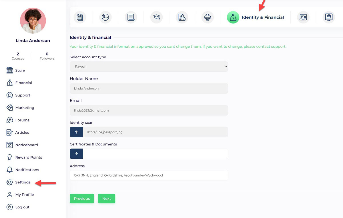 Users can define their payout account information from the “User Panel/ Settings/ Identity & Financial” menu.