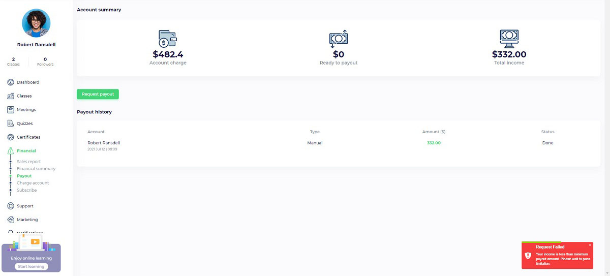 Instructors and organizations can request payouts from their User Panel/ Financial/ Payout. After a payout request is sent, the admin should review it and send money to your account.