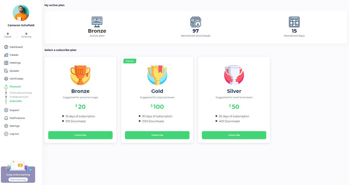 Subscribe plans will be displayed on the home page or “User Panel/ Financial/ Subscribe”.