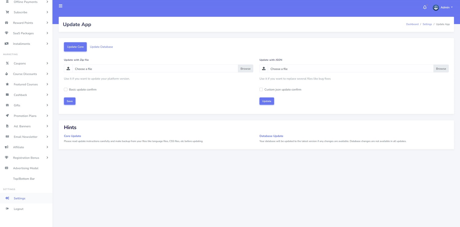 If you are using elder versions (1.4, 1.5, 1.6), you need to follow the update process documentation that we included inside the “Update” folder and update your platform to v1.7.